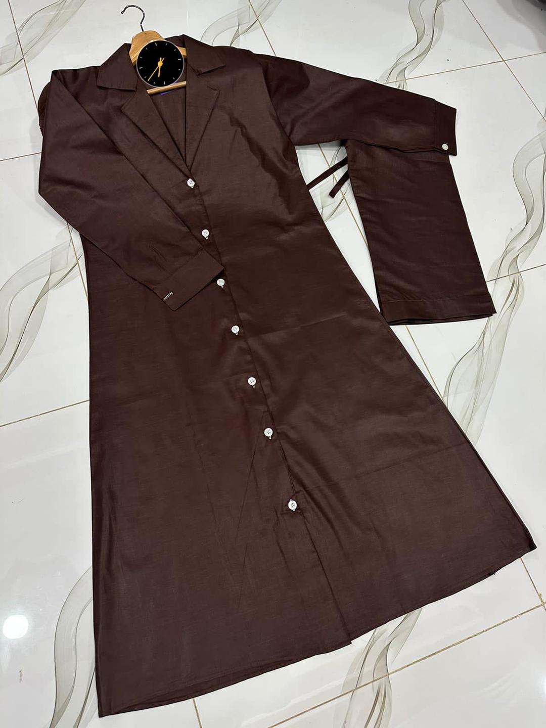 Stylish Women's Stitched Cotton Overcoat & Trouser Set - 2 Pcs in Brown Color - Standard Size